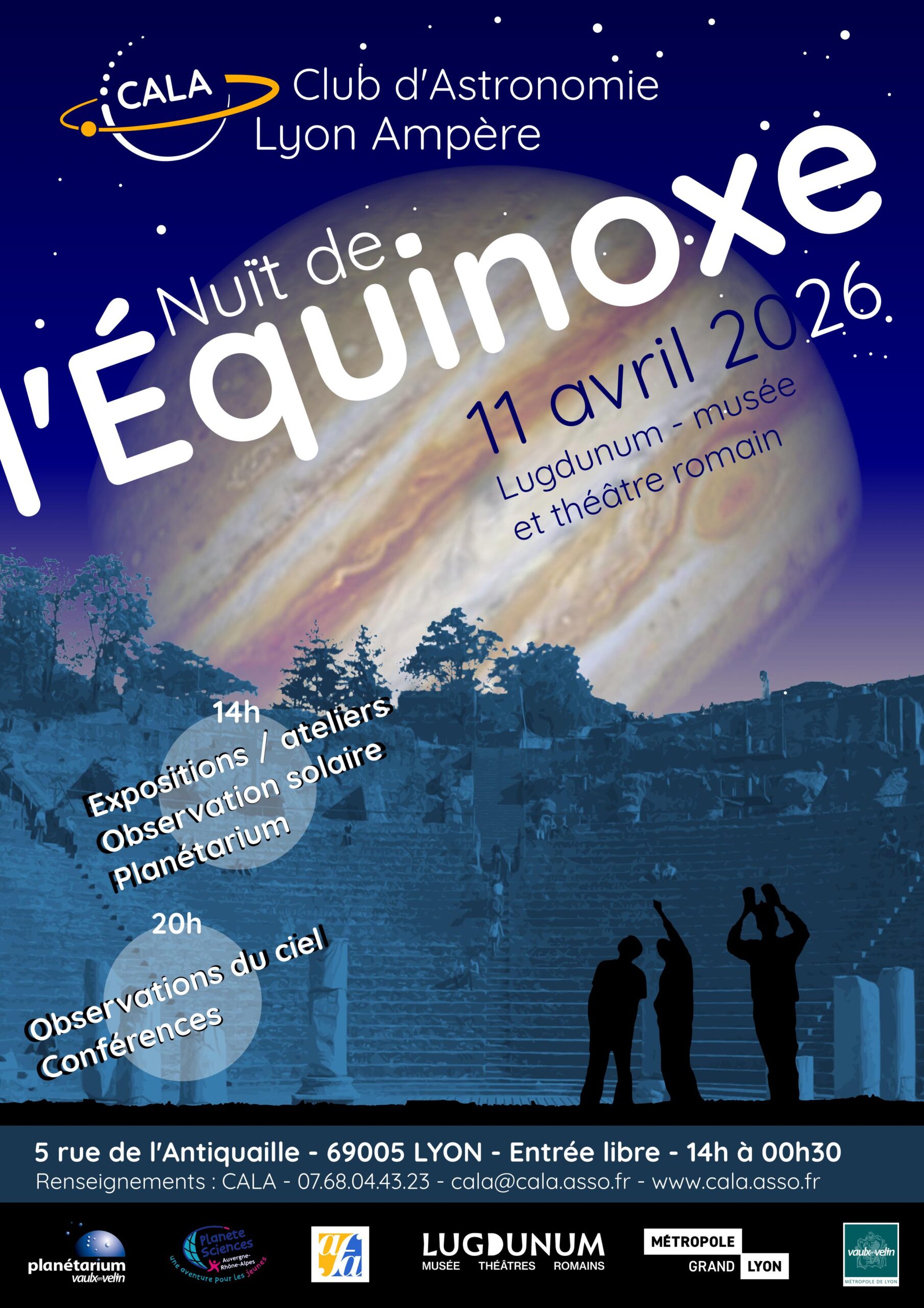 Le Club d’Astronomie de Lyon Ampère (CALA) et ses partenaires vous ouvrent les portes du temps et de l’espace lors de sa grande manifestation pour l’équinoxe de printemps. Rendez-vous au théâtre antique de Fourvière, joyau du patrimoine lyonnais, pour une journée et une soirée magiques sous les étoiles.